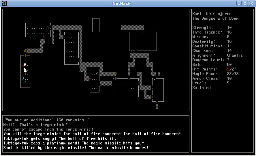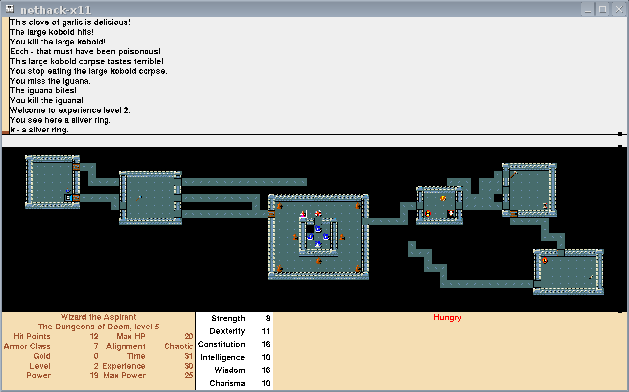 NetHack 3.4.3's X11 port, showing the hero on the Oracle level. Running on Kubuntu Linux 6.06.