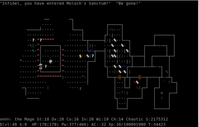 The high priest attending the temple of Moloch has, in addition to his usual priestly accoutrements, the Amulet of Yendor. The courtyard surrounding his temple contains nine priests of Moloch, a horned devil, a barbed devil, an erinys, a marilith, and a nalfeshnee; in addition to the standard undead in the marked graveyard, the level also contains two random L and three random V. The temple is surrounded by fire traps, and a secret door is placed randomly on one wall; there are also two more fire traps, a spiked pit, a magic trap, an anti-magic trap, and a sleeping gas trap randomly elsewhere on the level. Four pieces of armor, two tools, a gem, four potions and five scrolls are randomly located about the level, as well as the usual chests in the graveyard. All walls are undiggable; also, the dividing line between the two halves of the level cannot be phased through by polyself into a xorn or earth elemental.